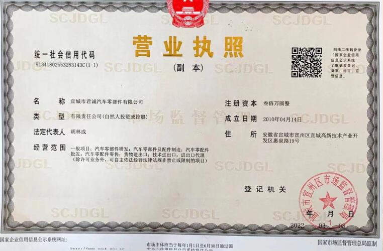 宣城市君誠(chéng)汽車(chē)零部件有限公司 地址:安徽省宣城高新技術(shù)產(chǎn)業(yè)開(kāi)發(fā)區(qū)惠泉路19號(hào)